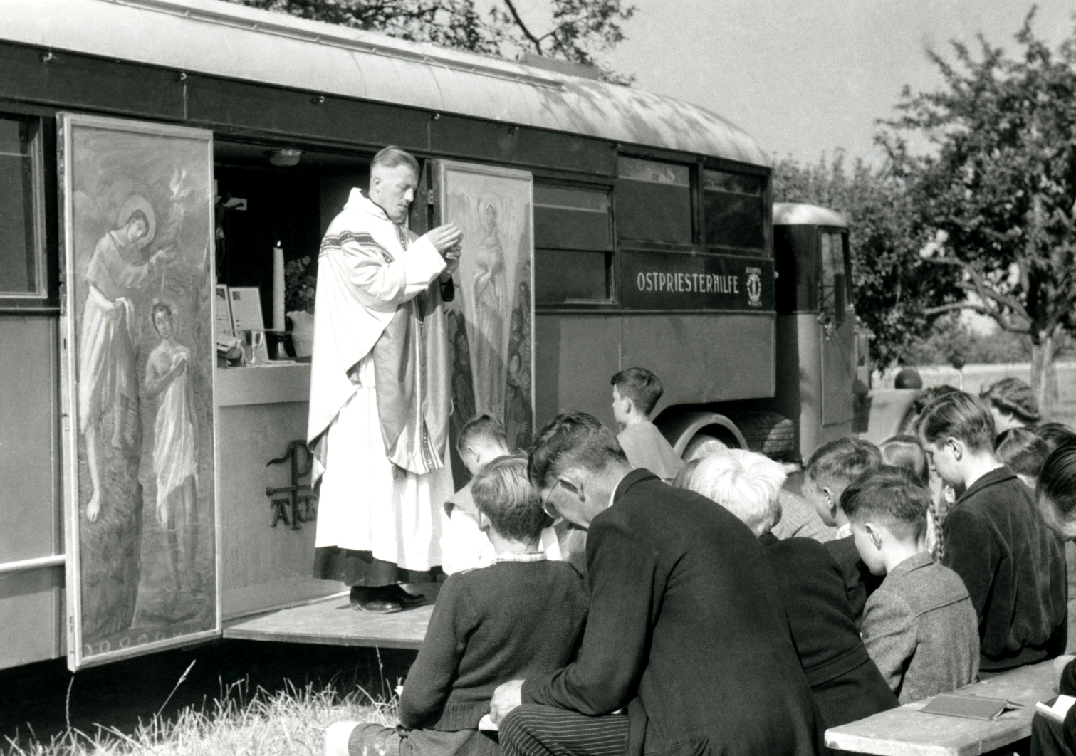 Es waren kleine Lastwagen, in deren Mitte sich ein Altar befand, der nach außen ausgeklappt werden konnte. Dort konnten die Priester die heilige Messe feiern, wenn sie die Gläubigen in Gebieten besuchten, wo es keine katholische Kirche gab. In diesen Kapellenwagen wurden auch Kleiderspenden und Lebensmittel transportiert. Diese Kapellenwagen waren außergewöhnlich, aber sie hatten Großartiges bewirkt. Die Heimatvertriebenen in der Diaspora hatten das Gefühl, nicht vergessen worden zu sein.