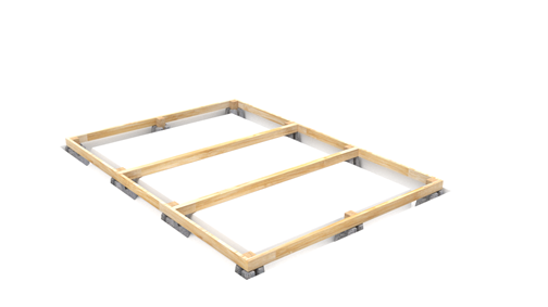 Schneiden Sie mit Hilfe der Säge die Holzbretter in der benötigten Länge ab, um den Rahmen mit zwei parallelen Querträgern zu bilden. Bauen Sie den Bodenrahmen zusammen und bringen Sie ihn an dem tragenden Rahmen mithilfe der Metallwinkelverbinder an. Mit der Wasserwaage prüfen Sie, ob der Rahmen perfekt eben ist. Messen Sie auch die Länge der Diagonalen des Rahmens mit einem Maßband. Sie sollten gleich sein.