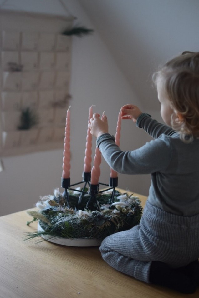 Durch stimmungsvolle natürliche Deko, weihnachtliches Basteln, Plätzchen backen und schöne Lichtern.
