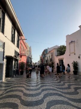 Zwischen verspielten Fliesen und knallbunten Häusern fanden wir uns dann nach einer halben Stunde Fahrt mit dem Zug wieder. Es gibt Cafés und Restaurants wie Sand am Meer und überall im Wasser schwimmen kleine Bötchen. Der Hochsaison im Sommer geschuldet, ist es am Tag sehr voll, weil ein Tagesausflug hier hin längst kein Geheimtipp mehr ist. Deswegen bleibt einfach etwas länger und genießt noch den Sonnenuntergang hinter der Bucht von Cascais.
