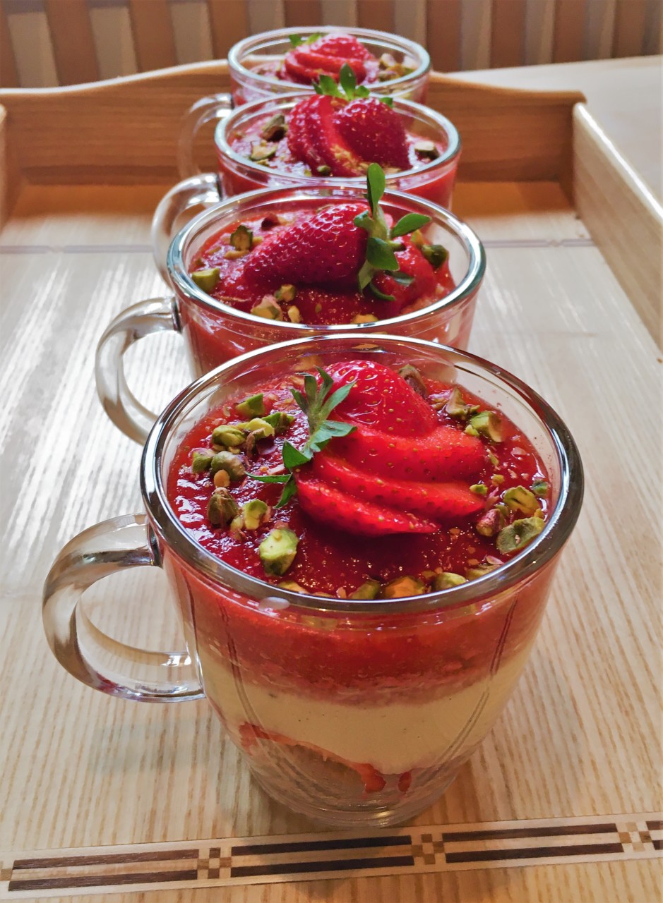 4. Nach Auskühlen des Puddings die einzelnen Zutaten schichten: Keksmasse, Erdbeeren, Pudding, Keksmasse und zum Schluss die Erdbeeren zur Deko. Abschließend die Pistazien klein hacken und um die Erdbeeren herumstreuen.
