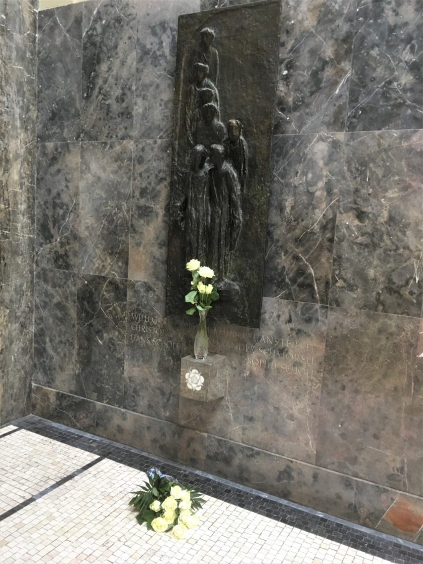 Die Gedenk- und Vortragsveranstaltung begann mit der Niederlegung weißer Rosen am Denkmal der studentischen Widerstandsgruppe im Lichthof der Münchener Universität – jenem Ort, an dem Sophie Scholl die gegen Hitler und sein Regime gerichteten Flugblätter der Weißen Rose verteilte und dabei entdeckt wurde. „Weil sie die Menschlichkeit hochhielten, starben sie einen unmenschlichen Tod“, steht auf der Gedenktafel im zweiten Stock. Die Geschwister Scholl und weitere Mitglieder der Weißen Rose bezahlten den Widerstand mit ihrem Leben.